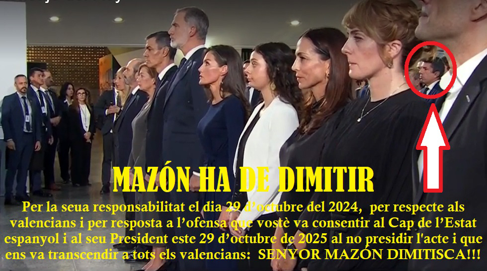 Per la seua responsabilitat el dia 29 d’octubre del 2024, per respecte als valencians i per resposta a l’ofensa que vostè va consentir del Cap de l’Estat espanyol i del seu President este 29 d’octubre de 2025 i que ens va transcendir a tots els valencians: SENYOR MAZÓN DIMITISCA!!!